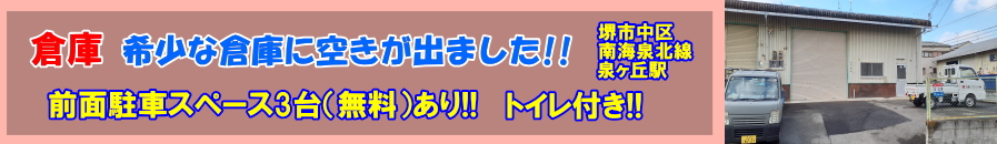 | 堺市中区 広くて前面駐車スペース3台有(無料)!トイレ付き倉庫になってます♪ |